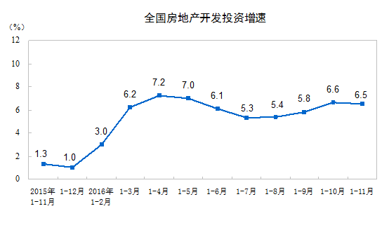 房地產(chǎn)開發(fā)投資完成情況 2016年1-11月份,全國(guó)房地產(chǎn)開發(fā)投資93387億元,同比名義增長(zhǎng)6.5%,增速比1-10月份回落0.1個(gè)百分點(diǎn)。其中,住宅投資62588億元,增長(zhǎng)6.0%,增速提高0.1個(gè)百分點(diǎn)。