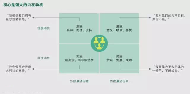 為了抵制這種傾向,組織意識到不能僅依靠外部激勵因素來激發(fā)人們的思維和內(nèi)心情感,還需要內(nèi)在激勵因素。外部激勵因素側(cè)重于個人獲得獎賞的愿望(而不是被懲罰),以及得到領(lǐng)導(dǎo)和同行的認(rèn)同。內(nèi)在激勵因素包括員工對工作中的意義、聯(lián)系和喜悅的渴望,以及對貢獻(xiàn)、發(fā)展和成功的渴望(參閱下圖)。初心是最強(qiáng)大的內(nèi)在激勵因素之一,因為它與思維(指導(dǎo)和調(diào)整行為的指南針)和內(nèi)心情感相呼應(yīng)。