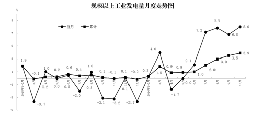 10月份,規模以上工業發電量同比增長8.0%,增速比上月加快1.2個百分點。1-10月份,規模以上工業發電量同比增長3.9%,比上年同期加快4.0個百分點。