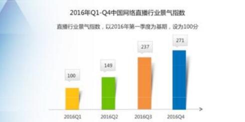 2016年我國的網(wǎng)絡(luò)直播行業(yè)實現(xiàn)了全年持續(xù)增長,以一季度100為基數(shù),第四季度中國網(wǎng)絡(luò)直播行業(yè)景氣指數(shù)為271,環(huán)比增長14.34%,在經(jīng)歷了前三季度的爆發(fā)式增長之后,中國網(wǎng)絡(luò)直播行業(yè)步入平穩(wěn)增長期。