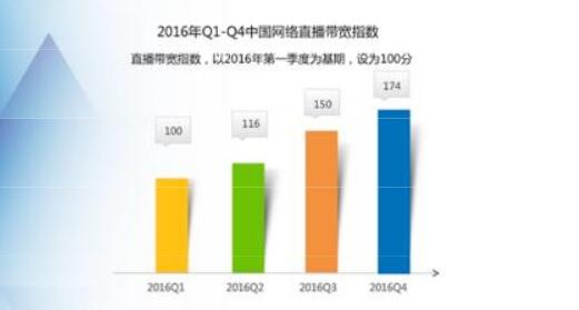 具體來看,延續(xù)前三季度網(wǎng)絡(luò)直播帶寬指數(shù)的持續(xù)增勢,2016年第四季度中國網(wǎng)絡(luò)直播帶寬指數(shù)為174,環(huán)比增長16%,與二季度的環(huán)比增速持平。