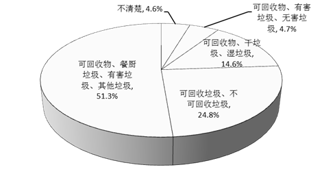 按照當(dāng)前的分類要求,生活垃圾主要有“四分類”(可回收物、餐廚垃圾、有害垃圾、其他垃圾),調(diào)查為了解受訪居民對(duì)現(xiàn)行分類要求的知曉情況,在設(shè)置問(wèn)題選項(xiàng)時(shí)混入了“可回收垃圾、不可回收垃圾”“可回收物、干垃圾、濕垃圾”等干擾項(xiàng)。