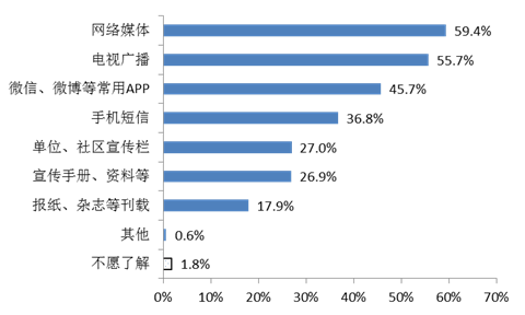 對(duì)于獲取生活垃圾分類相關(guān)知識(shí)的主要途徑,受訪居民選擇“網(wǎng)絡(luò)媒體”和“電視廣播”的比例最高,分別為59.4%、55.7%。此外,希望通過(guò)“微信、微博等常用APP”“手機(jī)短信”“單位、社區(qū)宣傳欄”和“宣傳手冊(cè)、資料”等途徑來(lái)了解垃圾分類知識(shí)的比例也較高(此題為多選,相加不等于100%,詳見圖4)。