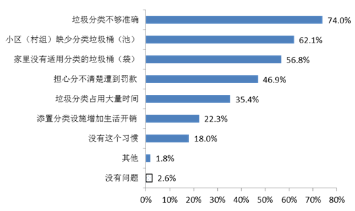 如果要進(jìn)行生活垃圾分類,受訪居民表示個(gè)人或家庭主要擔(dān)心的問(wèn)題是“垃圾分類不夠準(zhǔn)確”,選擇比例占74.0%;其次擔(dān)心“小區(qū)(村組)缺少分類垃圾桶(池)”,占62.1%;第三是“家里沒(méi)有適用分類的垃圾桶(袋)”,占56.8%。此外,選擇“擔(dān)心分不清楚遭到罰款”“垃圾分類占用大量時(shí)間”的比例也較高,都在35%以上(此題為多選,相加不等于100%,詳見圖2)。